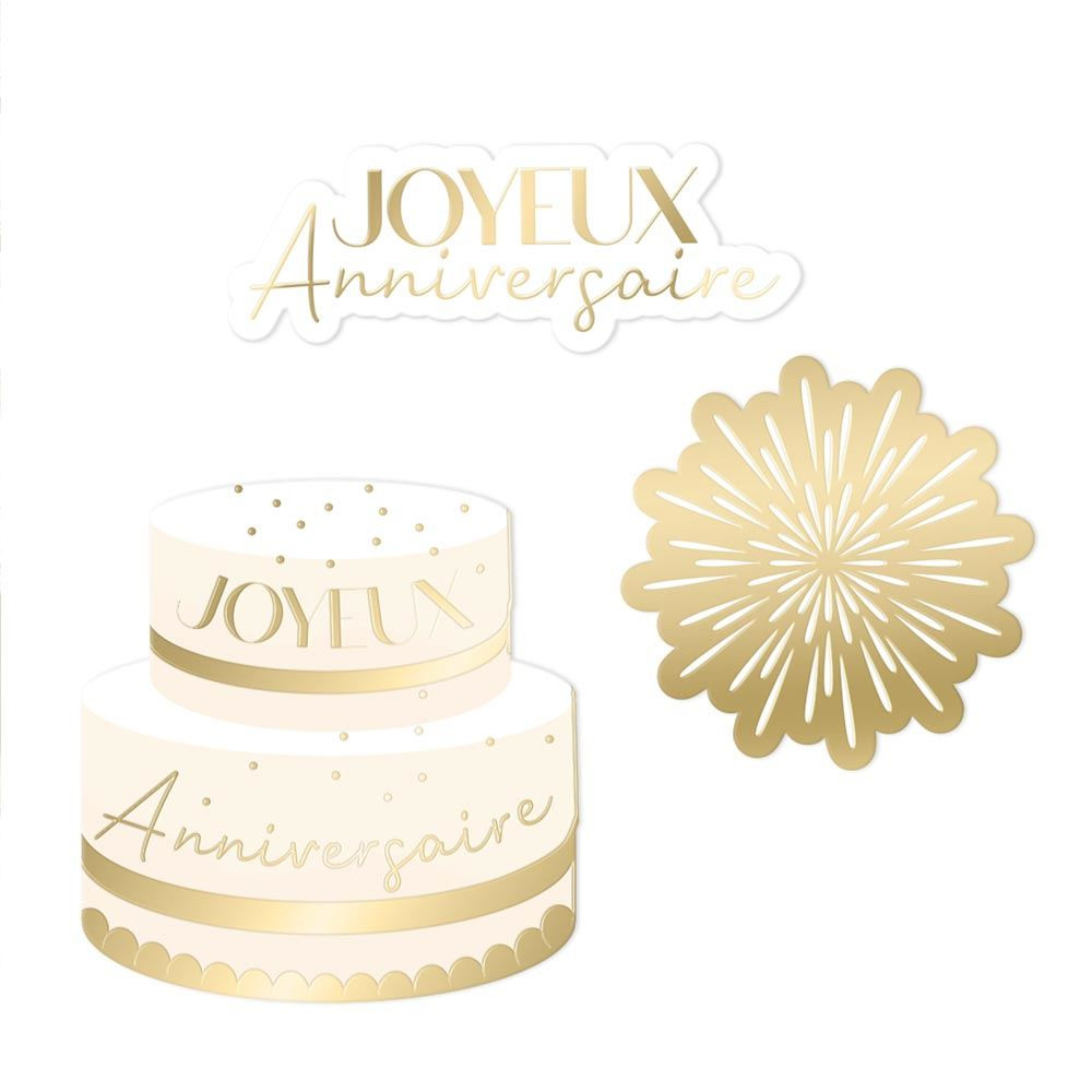 Mettez en avant votre décoration de table grâce à notre trio de décoration comportant un sticker "Joyeux Anniversaire" doré, un sticker gâteau et un sticker feu d'artifice.