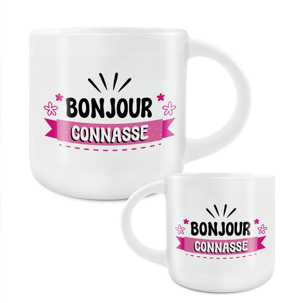 Ce grand mug "Bonjour Connasse" est une idée cadeau décalée à offrir à une proche pour sa fête ou un anniversaire.
