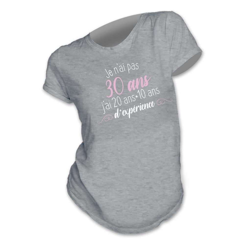 Une amie fête son anniversaire et vous cherchez un cadeau original ? Osez l exclusivité avec ce t shirt gris et son inscription blanche et rose "Je n ai pas 30 ans, j ai 20 ans + 10 ans d expérience" ! Ce t shirt, avec sa coupe cintrée et 100 % coton, de qualité supérieure est un présent qui ne manquera pas d’originalité et d élégance.