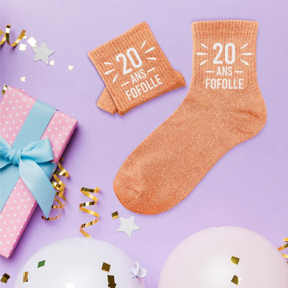 Ces chaussettes à paillettes oranges comporte la mention "20 ans Fofolle" et sont la garantie d'être stylée de la tete aux pieds.