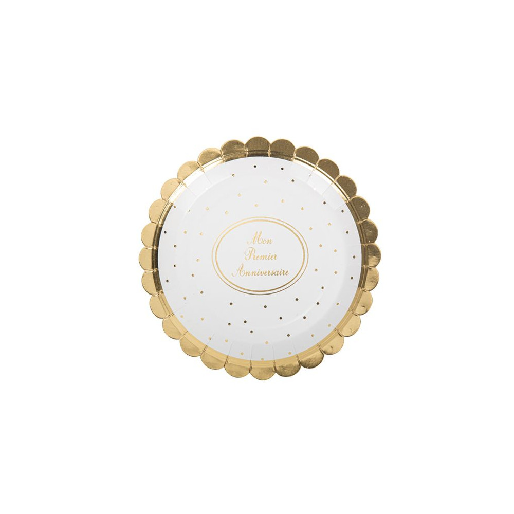 8 Assiettes "Mon 1er Anniversaire" Pois Carton Blanc et Or