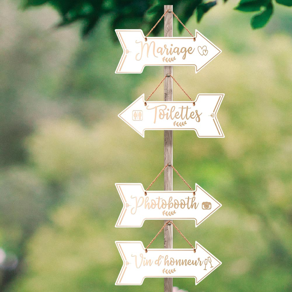 Tout en joignant l’utile à l’agréable, orchestrez un espace pour chaque situation avec ce pack de mariage conçu spécialement pour l’occasion. Pack de 4 flèches directionnelles. 1 flèche « vin d’honneur ». 1 flèche « toilette ». 1 flèche « mariage » et 1 flèche « photobooth ».