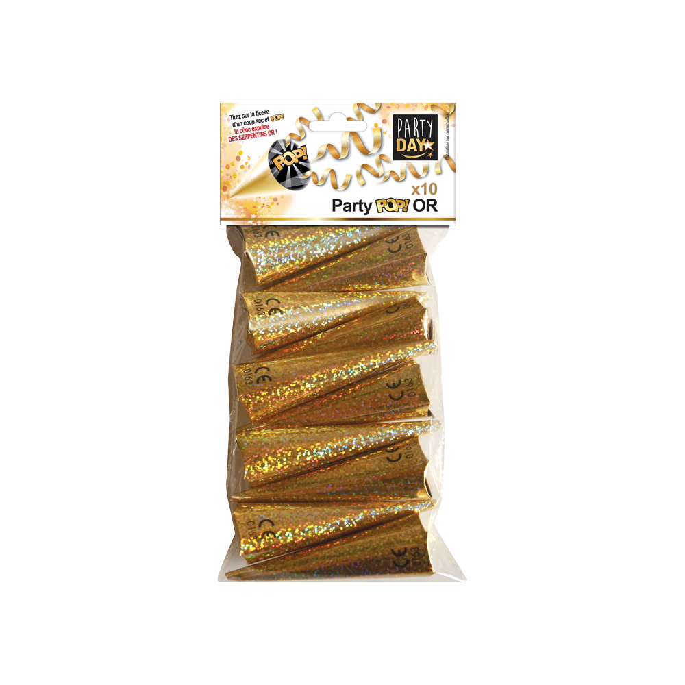 Petits artifices "POPPERS" dorés en forme de cônes : on tire sur la ficelle et CLAC ! Voilà de jolis serpentins dorés