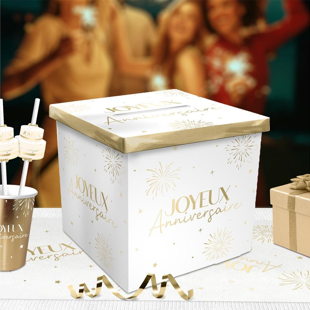 Que ce soit pour y mettre des petites attentions telles que des cartes de vœux ou pour y glisser quelques billets, cette urne cubique blanche de 20 x 20 x 20 cm arbore la mention "Joyeux Anniversaire" sur toutes les faces avec un motif d'étoiles et de feux d'artifice.