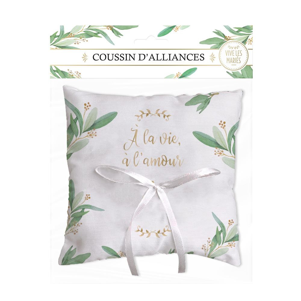Ce coussin blanc en coton dispose d'un ruban pour pouvoir y attacher les alliances. Il est cerné de tiges vertes effet pastel et arbore la mention "À la vie, à l'amour" en doré avec des couronnes de lauriers.